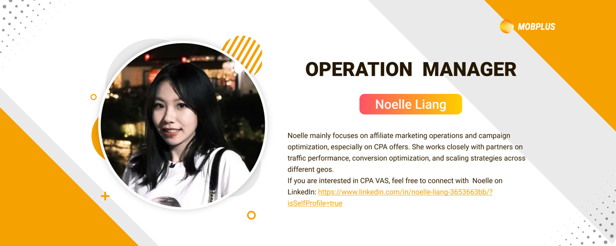 Noelle LiangNoelle mainly focuses on affiliate marketing operations and campaign optimization, especially on CPA offers. She works closely with partners on traffic performance, conversion optimization, and scaling strategies across different geos.We hope she will achieve great success and enjoy her journey with the team.