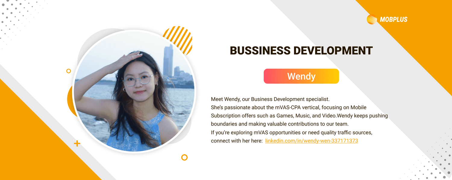 Wendy (Bussiness Development) Meet Wendy, our Business Development specialist. She’s passionate about the mVAS-CPA vertical, focusing on Mobile Subscription offers such as Games, Music, and Video.Wendy keeps pushing boundaries and making valuable contributions to our team. If you’re exploring mVAS opportunities or need quality traffic sources, connect with her here: Linkedin page: linkedin.com/in/wendy-wen-337171373/